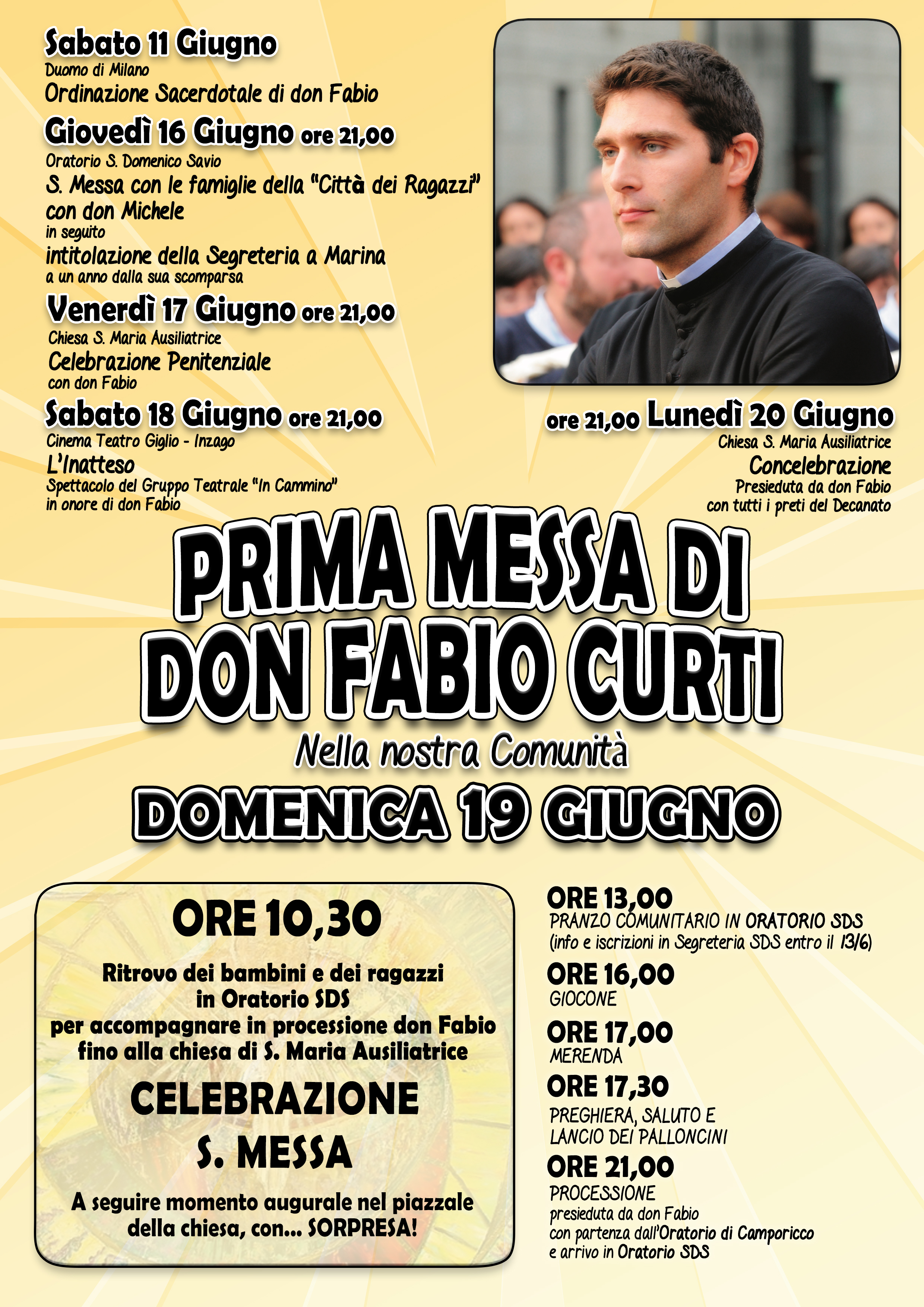 - Nelle tre chiese è possibile partecipare alla Festa da fare a don Fabio per la sua Prima Messa tra noi. Liberamente ciascuno può contribuire come può. Ciò che raccoglieremo verrà utilizzato per sostenere alcune spese, fare un dono a don Fabio e se dovesse avanzare qualcosa consegneremo a lui la busta.
