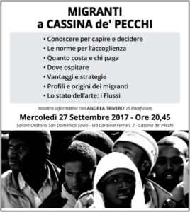 Il Centro Culturale Camporicco vi invita alla conferenza sul tema “Migranti a Cassina de’ Pecchi” che si terrà nel Salone dell’Oratorio San Domenico Savio, Mercoledì 27 settembre 2017, alle ore 20.45. Verranno chiariti in maniera chiara e precisa gli aspetti principali del fenomeno e sarà portata una testimonianza da chi ha già applicato soluzioni di successo sia per la comunità che ospita sia per chi è ospitato. L’importante per decidere è conoscere e capire.